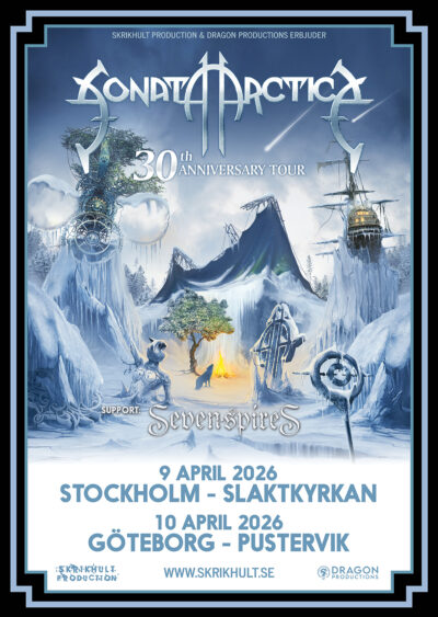 Sonata Arctica firar 30 år som power metal-gurus! Givetvis blir det ett stopp i Stockholm när bandet intar scenen Slaktkyrkan den 9 april och Göteborg på Pustervik 10 april. Dessutom tar de med sig det amerikanska symfoniska metalbandet Seven Spires som special guests!